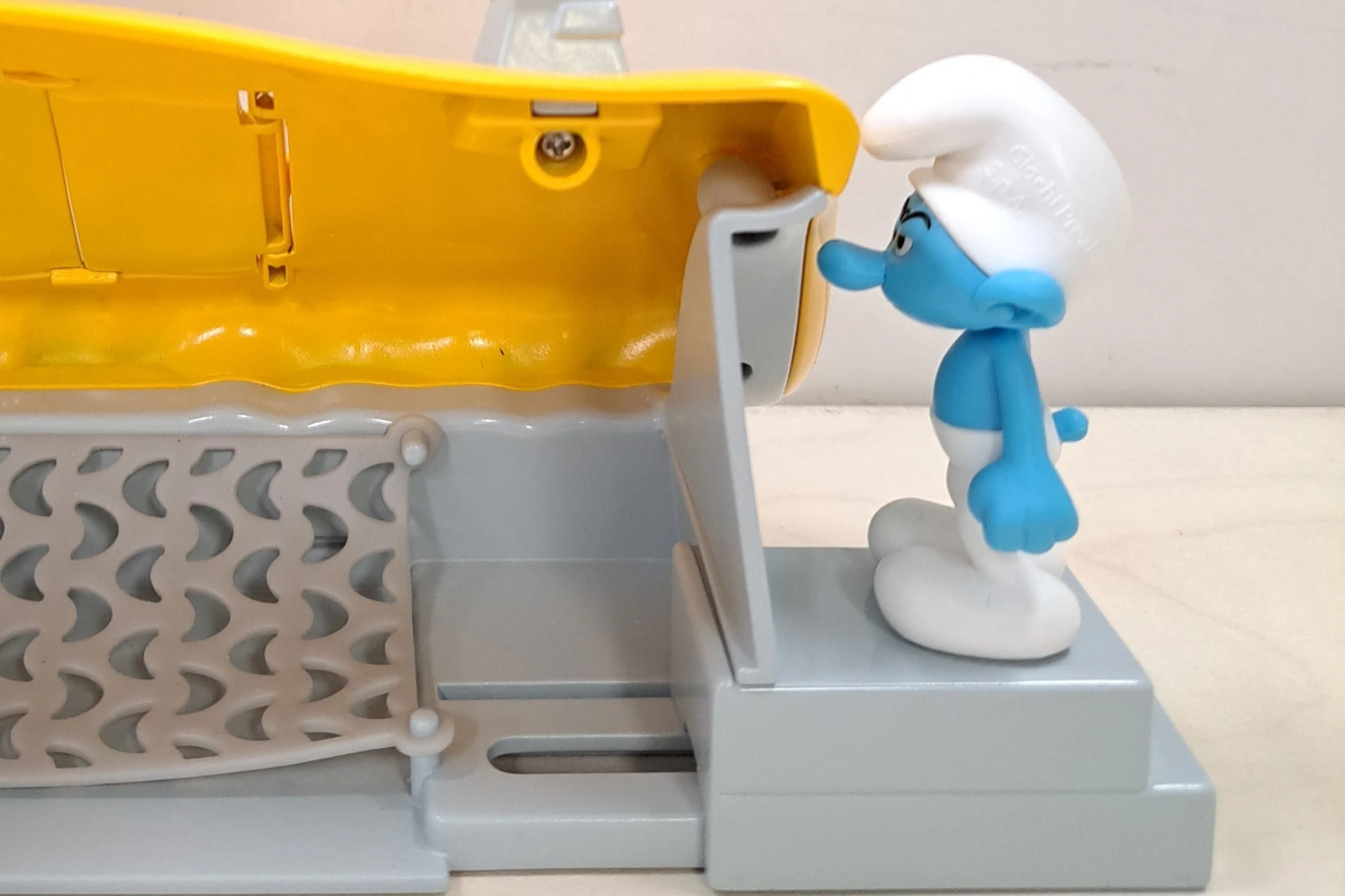 Button drops Smurf from cage & through trapdoor